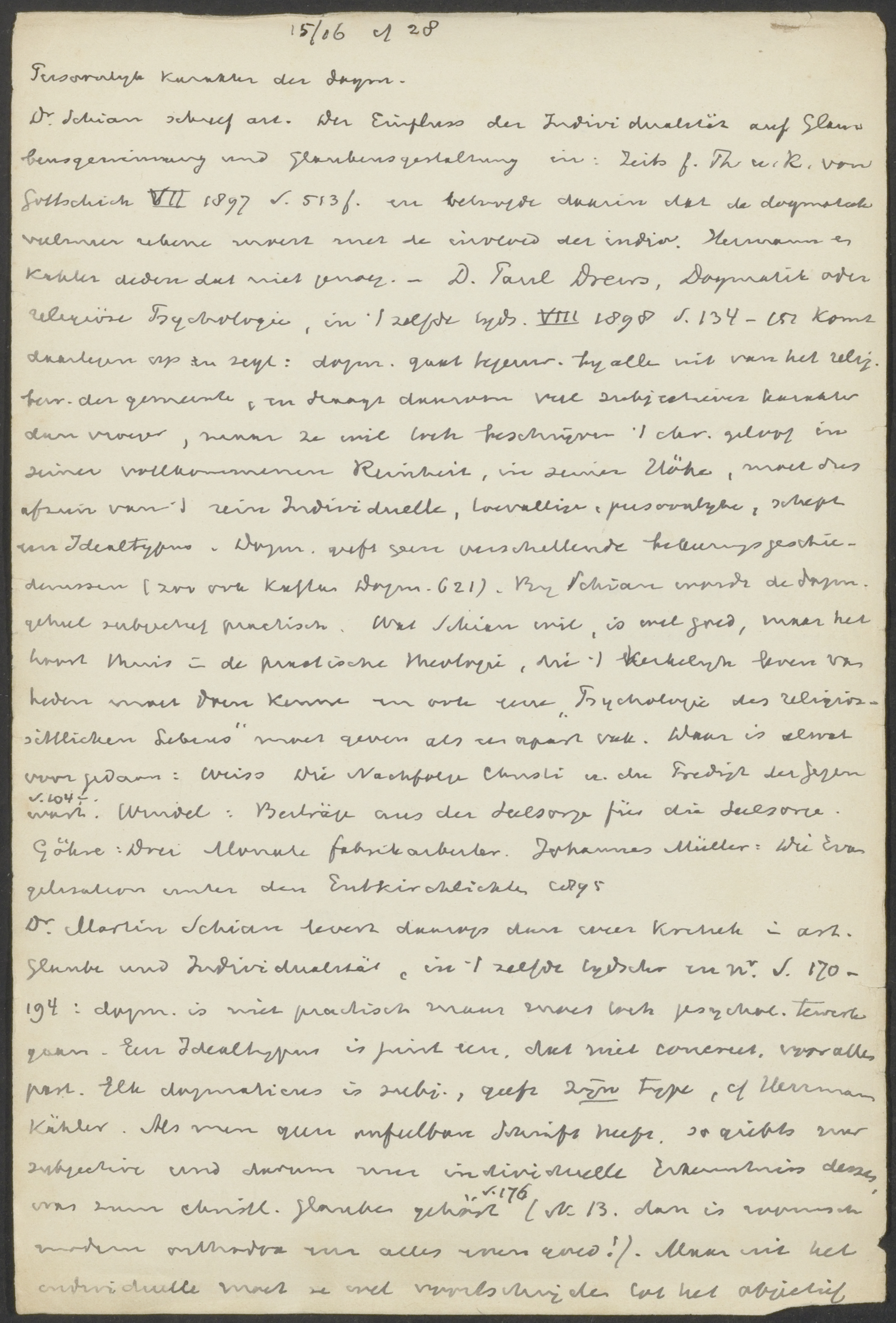 The archive holds more than 900 letters to and from Herman Bavinck, documents regarding his personal life and his family, like diaries, and documents related to Bavinck’s public role as pastor, journalist, politician, professor, church leader, and author: manuscripts, note books, lectures, class notes. Quite a few documents have no date or title, and are identified by the first words of the text. Notes and newspaper clippings are often inserted in documents.